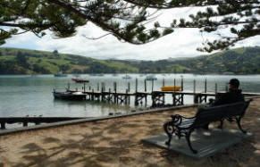 Hier zien we ook dat de kauribomen niet alleen kostbaar hout leverden, maar ook de hars van de bomen was op een gegeven moment meer waard dan goud. Er konden prachtige sieraden van gemaakt worden. Verder zijn er kostbare meubels van kaurihout te zien, als we denken dat we het gehad hebben krijgen we pas het echte museum te zien. De oude bedrijfshal is schitterend ingericht met de oude machines. En met bewegende delen van de machines krijgen we te zien hoe dat allemaal in zijn werk ging. In dit museum kun je de hele dag ronddwalen en dan heb je het nog niet allemaal gezien, onze dag is weer helemaal goed, alleen jammer van deze schitterende bomen waarvan je denkt, hoe konden ze deze kolossen met hand en ossenkracht verplaatsen. Als ze eenmaal gekapt waren moesten ze toch naar de houtzagerij verplaatst worden. We zetten de ruitenwisser een standje hoger en rijden verder. Na Dargaville verandert het landschap, maar niet het weer. De hellingen zijn plotseling weer begroeid met regenwoud dus we hebben nu het weer wat bij het landschap past en ook de kauribomen zijn weer overal in het landschap aanwezig. In Oponani staat een standbeeldje van een dolfijn, jaren lang kwam deze dolfijn elke dag naar de baai om met de kinderen van het dorp te spelen, maar helaas hebben vissers die illegaal met dynamiet visten hem opgeblazen, de daders hebben ze nooit gevonden en de dolfijn kreeg een standbeeld. Door een weelderig begroeid landschap steken we het eiland over naar Waitangi. Een van de meest historische plaatsen van Nieuw Zeeland. Hier tekende de Maori een verdrag met de Engelsen waardoor er een einde moest komen aan steeds weer terugkerende gevechten. Waitangi ligt op een schiereiland aan de Bay of Islands, dat is uitgegroeid tot een van de populairste vakantie oorden van het Noorder Eiland. De baai heeft de meeste zonuren van heel Nieuw Zeeland en alle watersporten die maar te bedenken zijn worden hier te beoefenen. Wij gaan er weer zwemmen met dolfijnen, na Kaikoera hebben we daarvan de smaak te pakken. Hier treffen we een ander soort dolfijn aan, de Bottlenose (we wisten niet dat er zoveel soorten waren), deze zijn groter en wat bedaarder dan de Dusky dolfijnen die we in Kaikoura aantroffen.