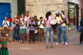 Dus was het niet moeilijk kiezen wat we vandaag zouden doen,naar de kabelbaan dus die ons naar de top van de Tafelberg brengt. We waren vroeg, maar het was toch al behoorlijk druk. Dat was ook wel te verwachten, want de top is vaak in de wolken verscholen, dus iedereen nam nu zijn kans waar. Af en toe verdween de gondel toch nog even in een wolkenflard zodat het zicht even weg was, maar kwamen we er uit dan was het uitzicht overweldigend. Wat een uitzicht. Boven was goed te zien hoe de stad de Tafelberg helemaal insluit. Boven op de berg wemelt het van de klipdasjes. Na ruim 1 uur op de berg te hebben rondgedoold daalde we weer af naar de stad en zetten we koers naar het Waterfront, na de Tafelberg de grootste Attractie van Kaapstad. Het is een grote toeristische happening met talloze restaurants, terrasjes en knusse winkeltjes. Je kunt er zeiltochten boeken maar ook met een helikopter omhoog en een vluchten rond de Tafelberg maken. Op een gezellig pleintje spelen onder de boom orkestjes vrolijke Afrikaanse liedjes. Hier kunnen we het zonder probleem een middag volhouden en dat doen we dus ook.